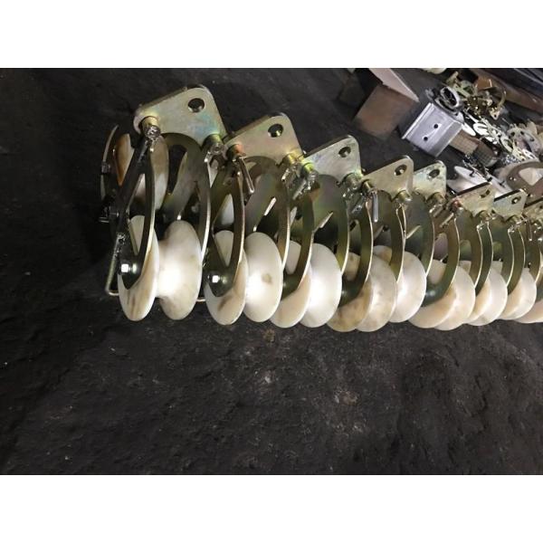 Model SHR-2.5 Stringing Block With Tandem Sheave is used for releasing the aluminum wire, ACSR, insulated wire in pole and tower erection.The wheel groove can be through with clamp pipe.